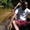 Demoine habite sur l'ile Portal au milieu du Maroni, il rentre chez lui en pirogue.